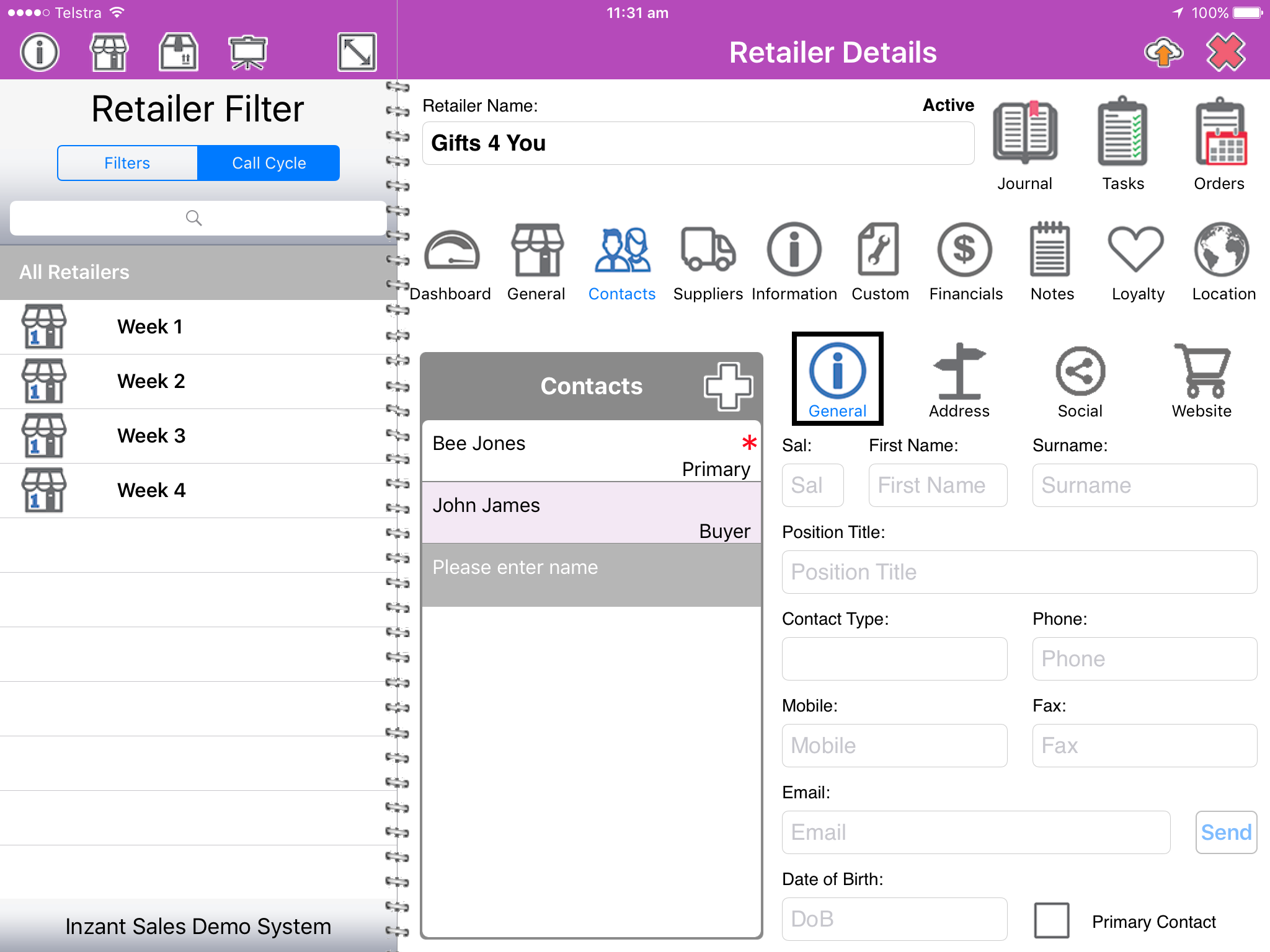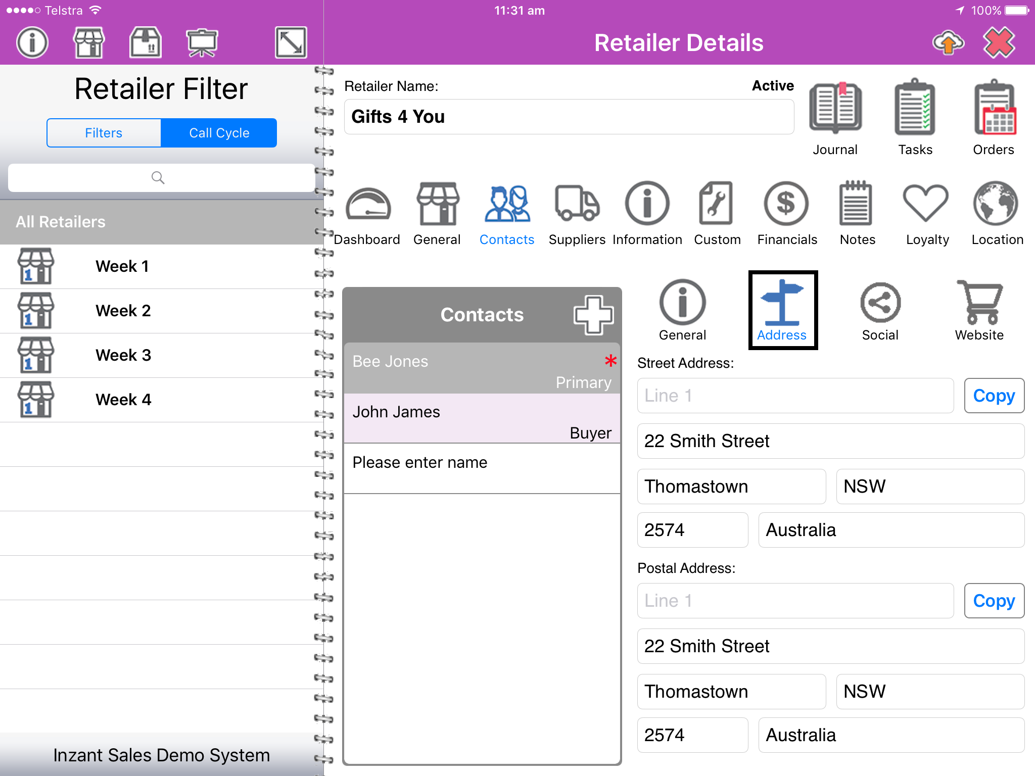 Within Inzant Sales Retailers represent the customers you will be visiting and selling to, and Contacts represent the people you interact with whilst dealing with the Retailer. Contacts are stored and managed on the Retailers screen, under the "Contacts" tab.