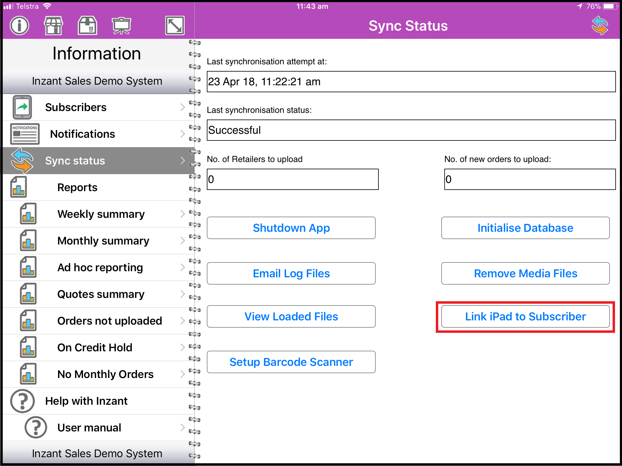 8. You will now see the "Sync Status" screen touch "link iPad to subscriber".