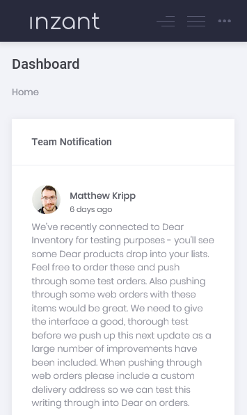 The sidebar works in a very similar fashion whilst in responsive mode. By default it is hidden (to maximise screen space on the main page content). To display the sidebar tap the modified hamburger icon in the top bar (icon closest to the Inzant logo).