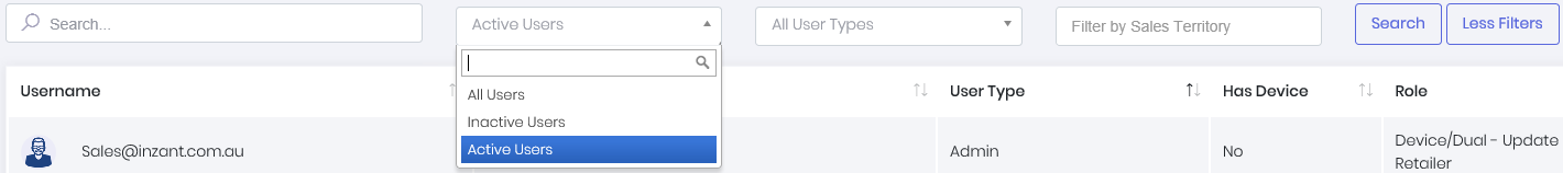 Detail screens in Inzant are arrived at via Search screens, and will contain all the details required to Add/Edit/Deactivate the entity being viewed. For entities with lots of information stored (like Users), the details screen will have several tabs with editable zones across each of the tabs.