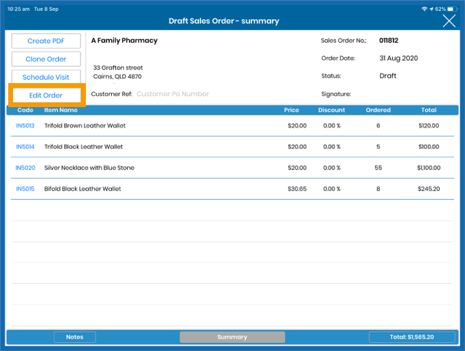 - On the Order Summary page touch 'Edit Order' to change the Status of the order. If the order is already processed the 'Edit Order' button will appear in grey and unable to use.