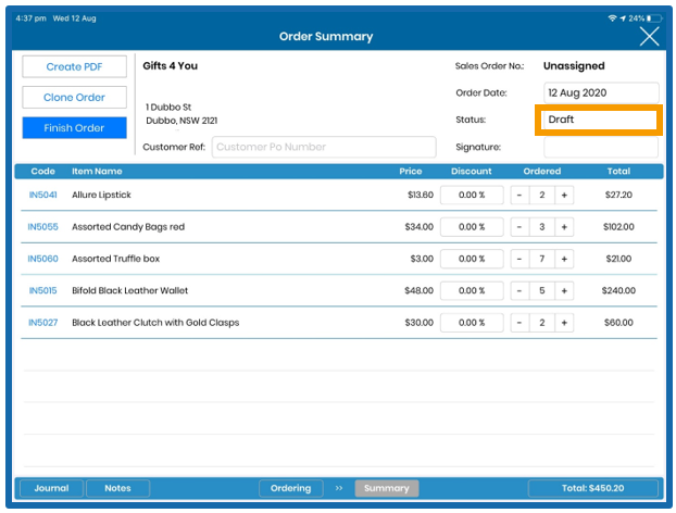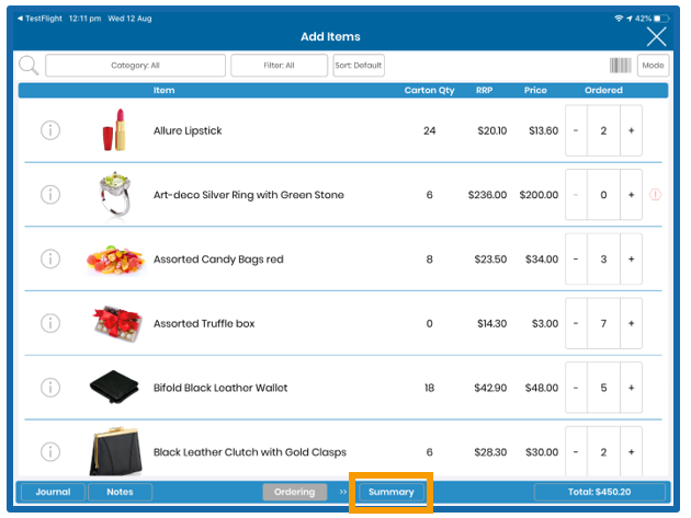 - To get to the order summary screen from any uncompleted order, touch on 'Order Summary' on the ribbon at the bottom of the screen.