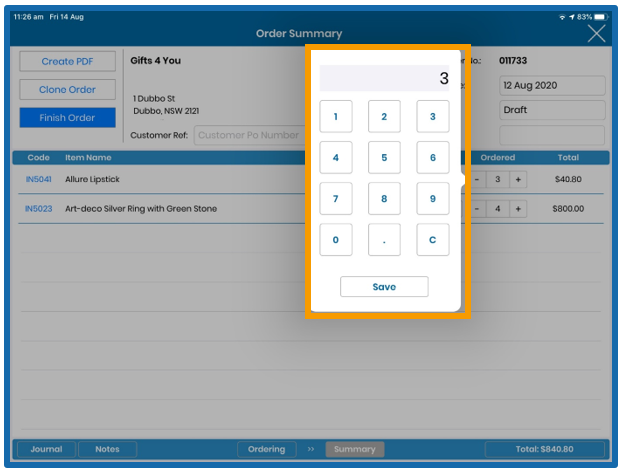 - Touch the relevant field and a popover will display, change the quantity and touch Save
