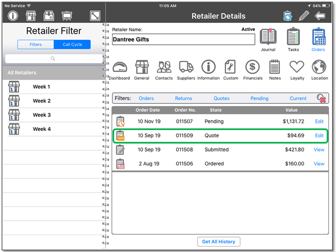 To edit a quote, Log onto Inzant Sales Plus App and select the Retailer, then Click 'Orders'.