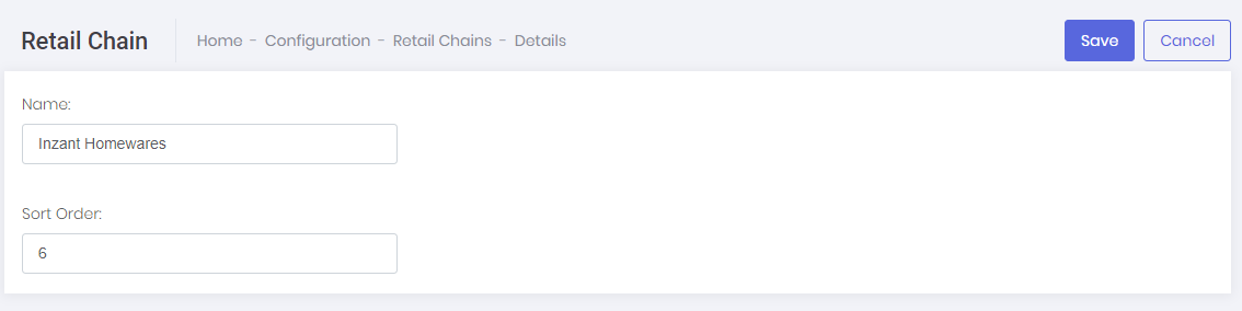 Once the Retail Chain Details screen is open, enter the new Name and click the save button in the top right of screen.