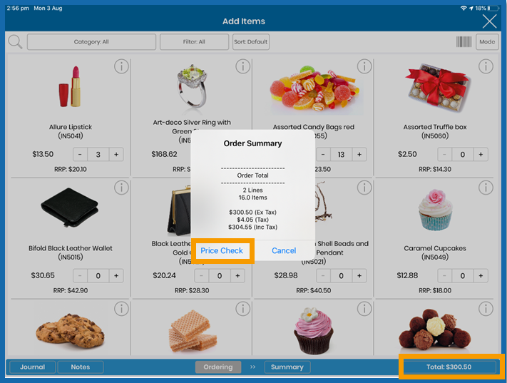 When the Order Summary window pop-up appears, touch 'Price Check'. If you no longer wish to conduct a price check, touch cancel.