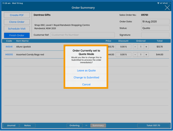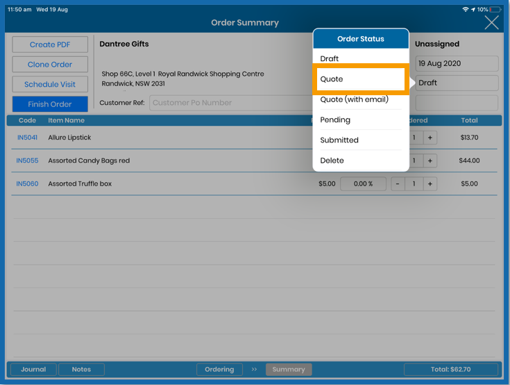Touch into this field to see the Order options now available. To save the Order on your iPad, change the Status to either 'Draft' or 'Quote',
