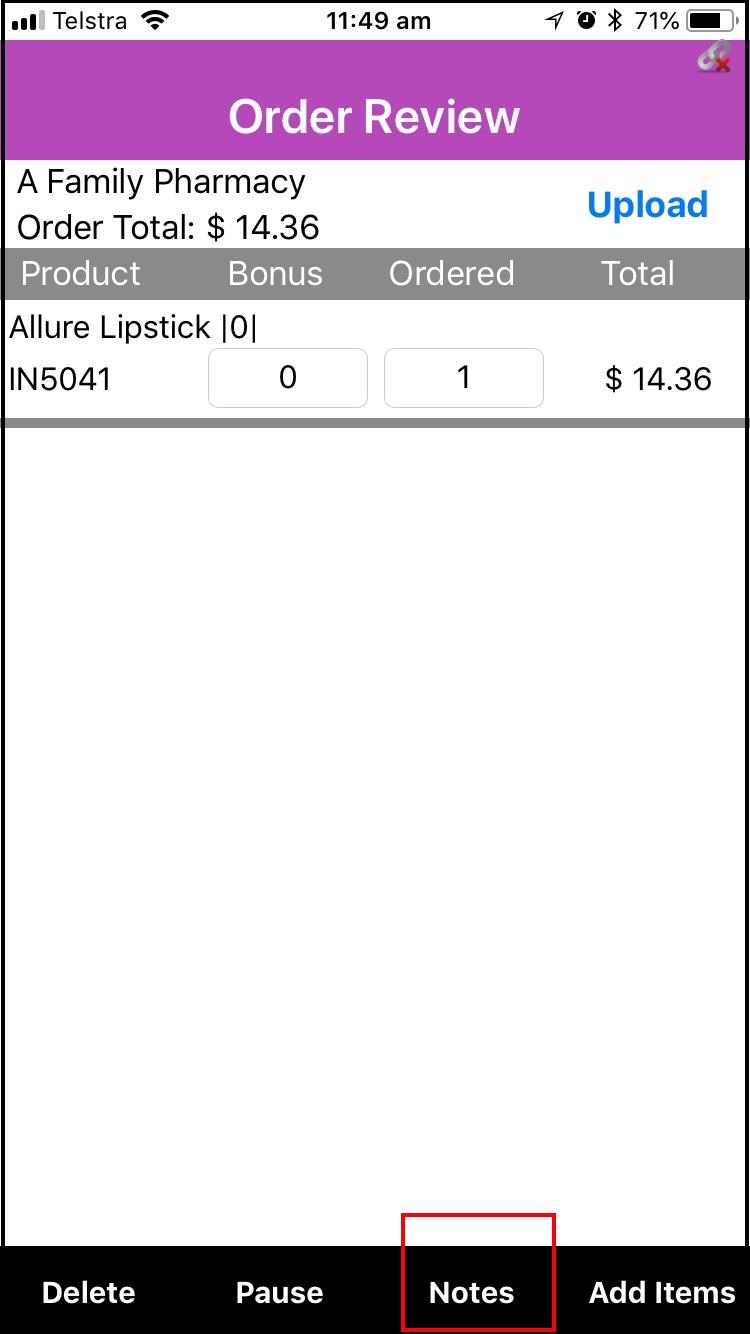 - This will display the Order Review screen. If an order was previously started, any items will be shown.