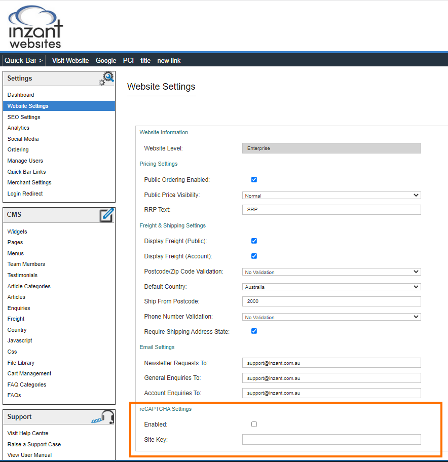 2. On the Website Settings page, in the reCAPTCHA settings: